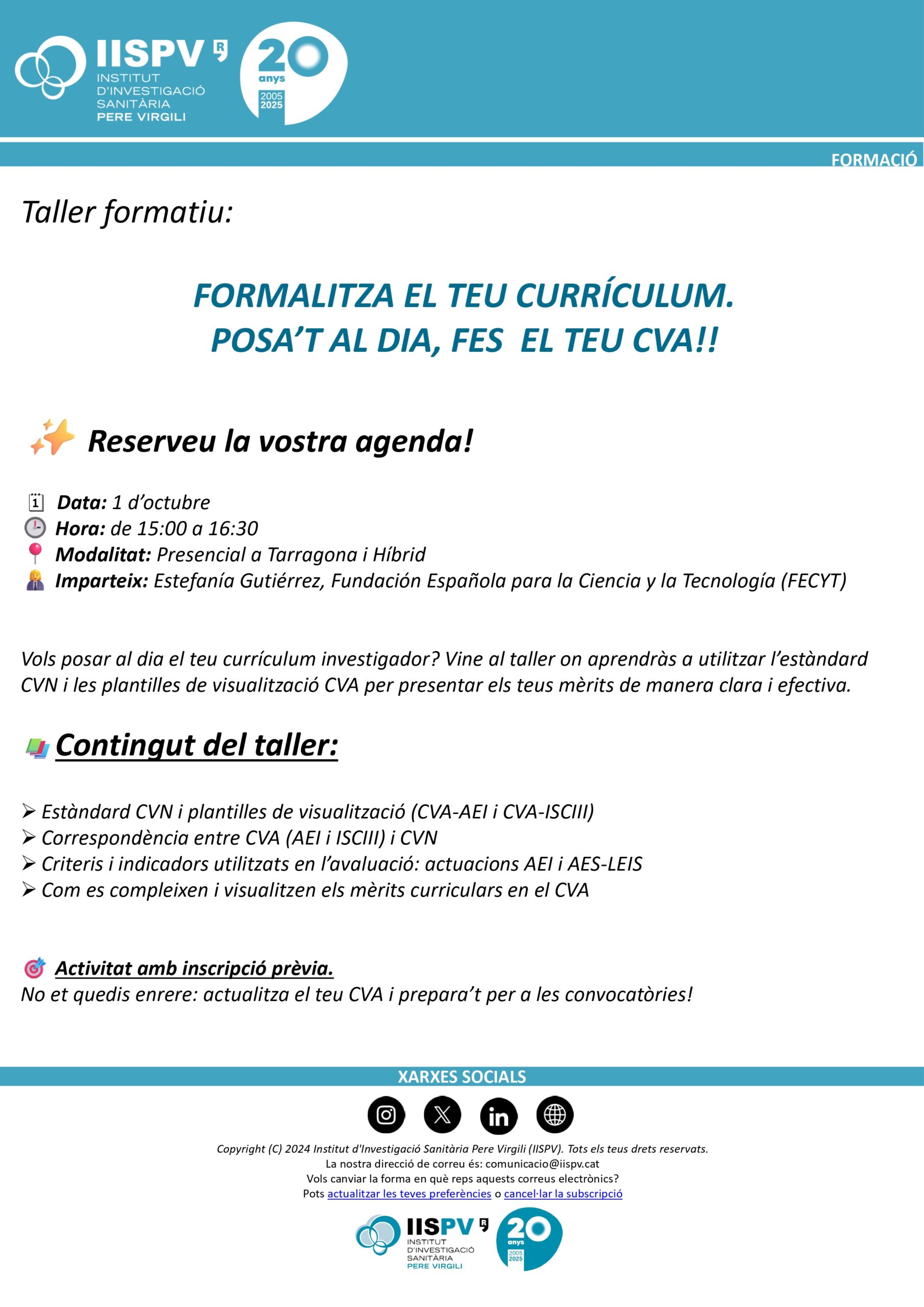 DURADA I FORMAT: El curs té una durada total de 1:30h en format Híbrid. Serà presencial a la Sala de reunions del IISPV de Tarragona
