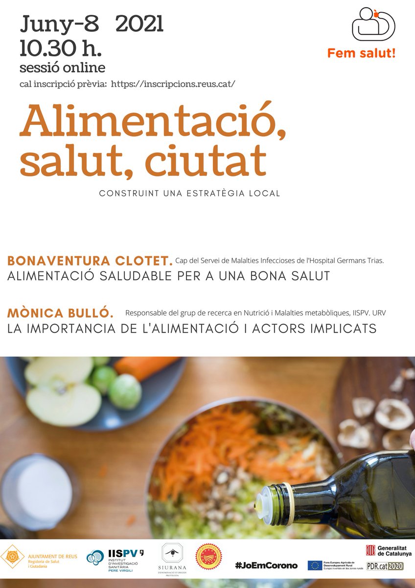 El pròxim dia 8 de juny, a partir de les 10:30 h, es durà a terme la Jornada Alimentació, salut i ciutat, construint una estratègia local, organitzada per la regidoria de Salut i Ciutadania, la DOP Siurana i IISPV, i comptarà amb la participació de Bonaventura Clotet i Mònica Bulló, que introduiran els canvis d’hàbits que la ciutadania hauria d’assumir per millorar l’alimentació i començar a qüestionar que cal transformar les ciutats per promoure una alimentació saludable.